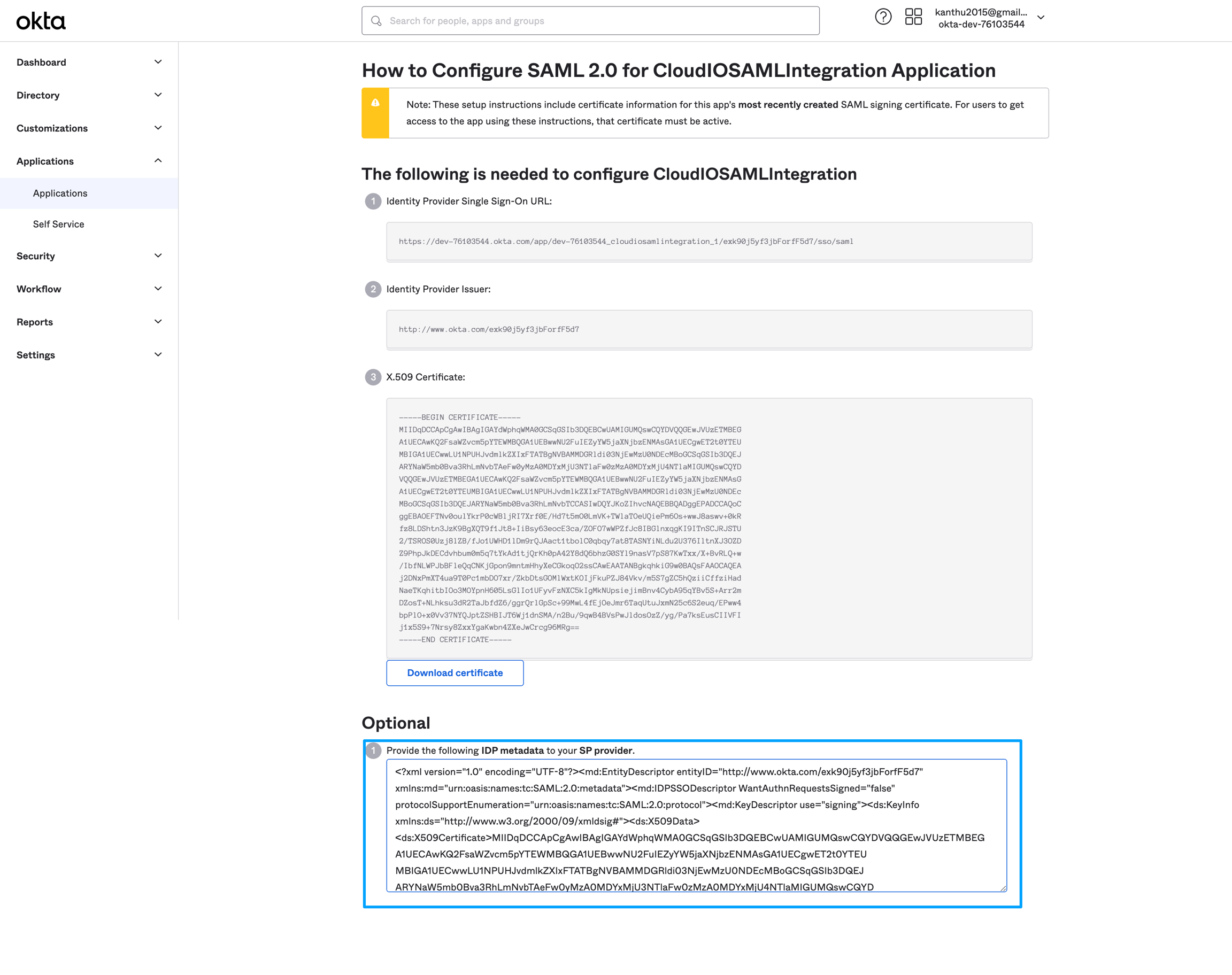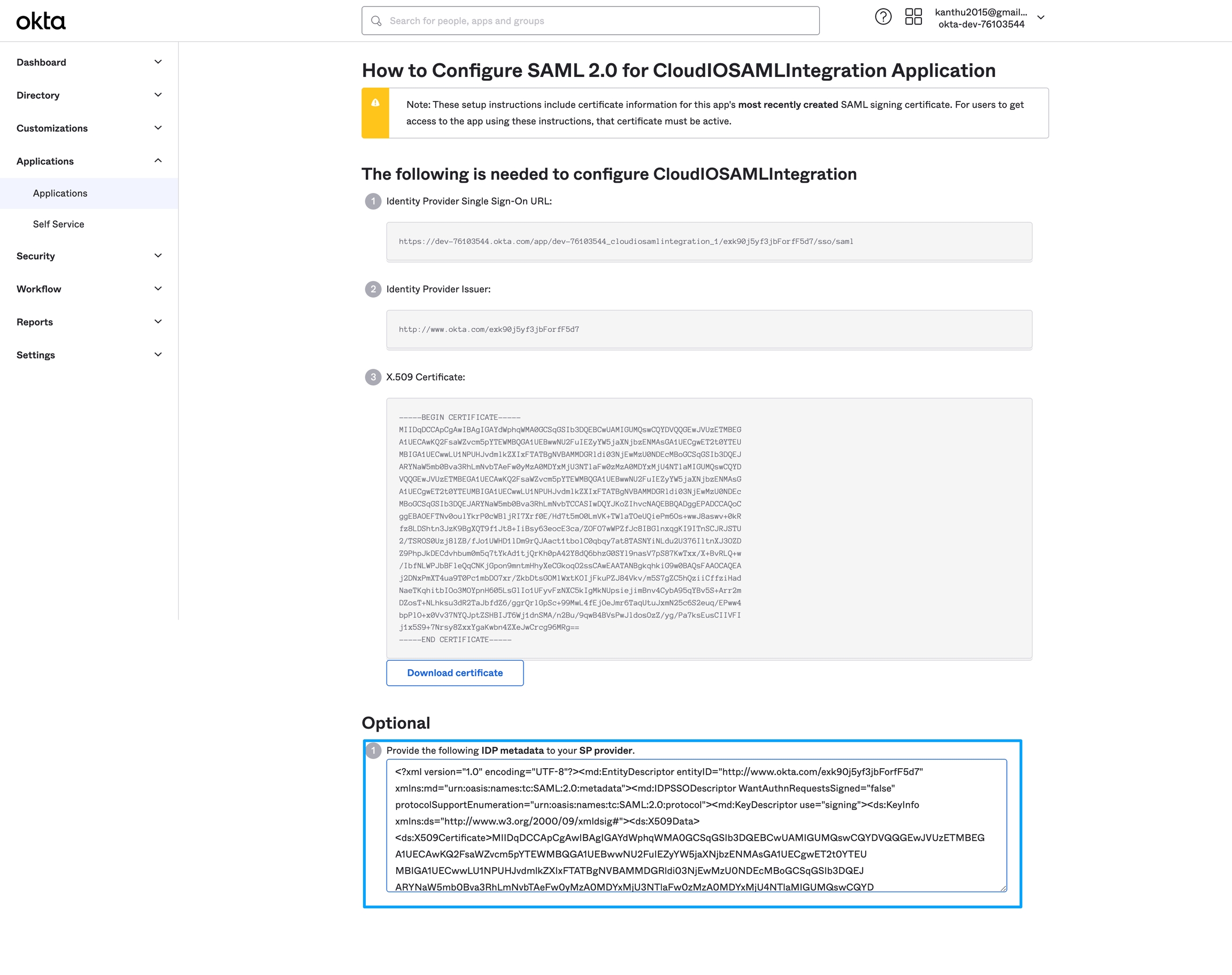 The App Integration was created and we need to retrieve IDP Metadata to finish the setup on CloudIO. Scroll down, and click on the View SAML setup instructions link. Copy the IDP metadata.